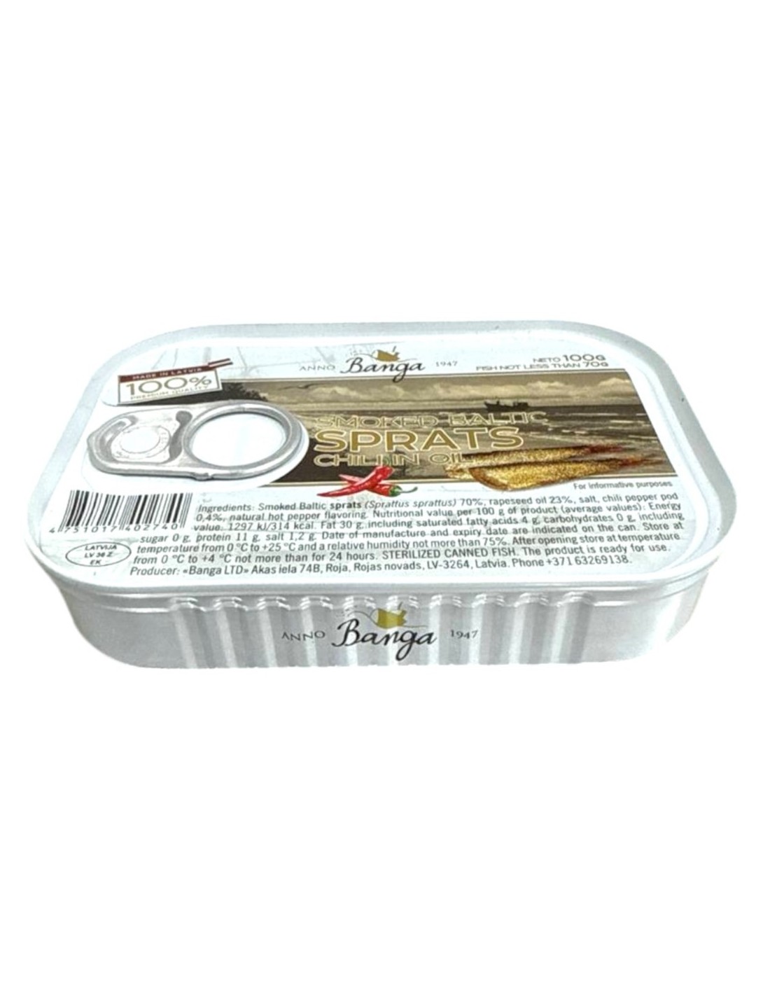 Dudlangan Baltika shprotlari chili yog'da "Banga" (100g)